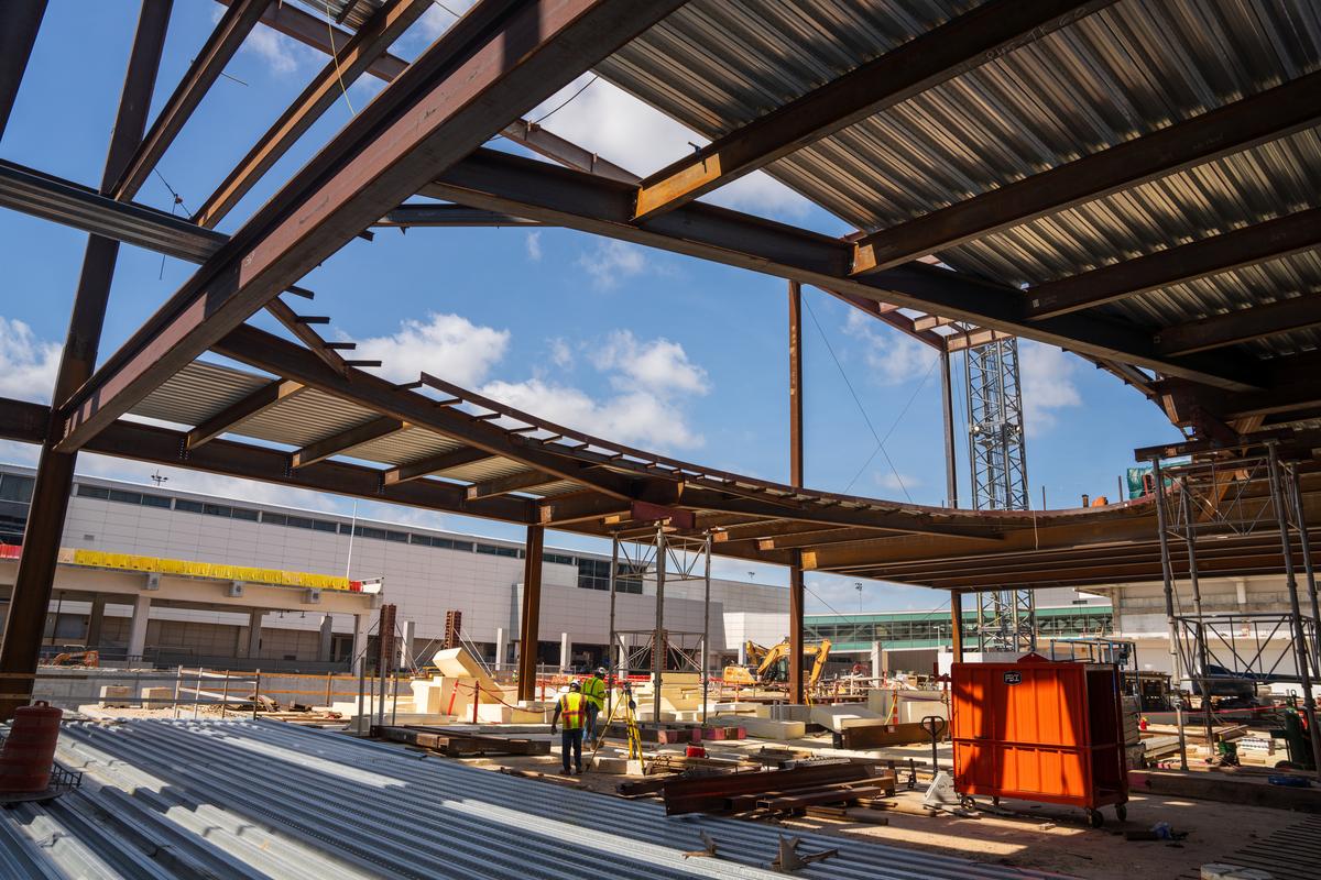 The steel framing for an oculus, measuring 38 feet by 84 feet, in the new International Central Processor is now in place. Once completed, the Oculus will feature 2,000 feet of digital display visible to passengers on two levels of the new building that will house 66 check-in kiosks and 17 lanes for TSA security and baggage claim.