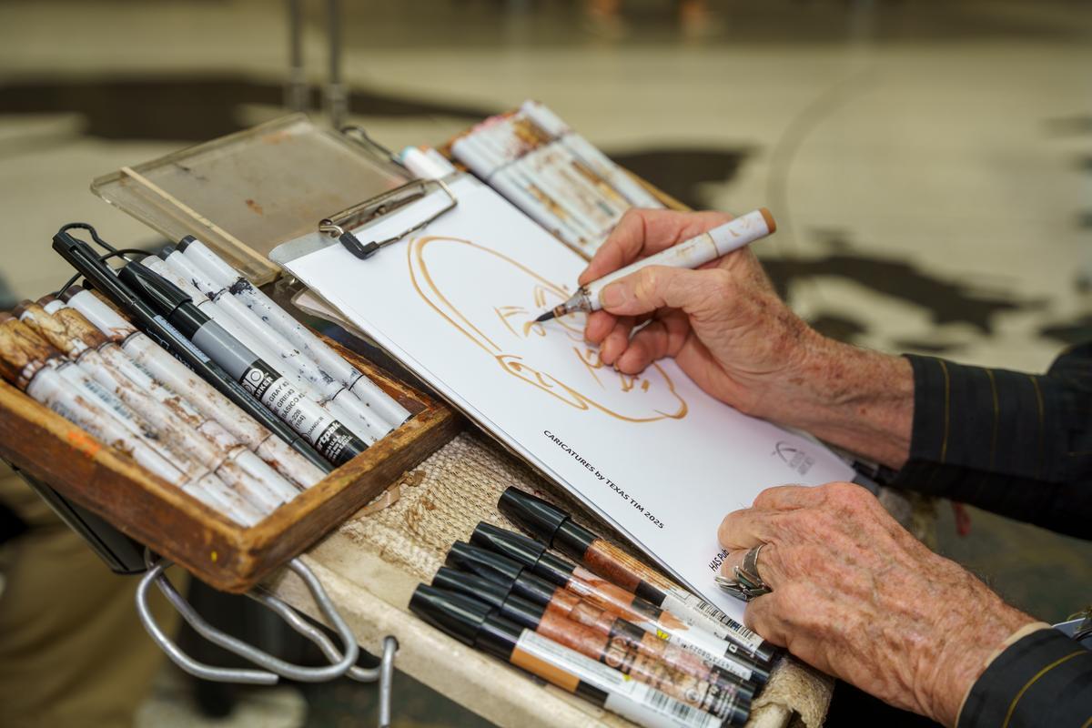 Texas Tim, a fixture in Houston’s art scene for more than 50 years, is known for his ability to capture personalities with humor and style. His exaggerated yet expressive portraits blend skill and entertainment, turning everyday moments into memorable works of art.