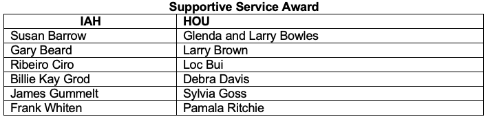 This year, Houston Airports also recognized 12 recipients of the Supportive Service Award, six at each airport. The award honors volunteers who regularly go beyond their assigned roles to keep the program running smoothly. Selecting recipients was difficult, Ghica said, because the same commitment shows up daily across the program.