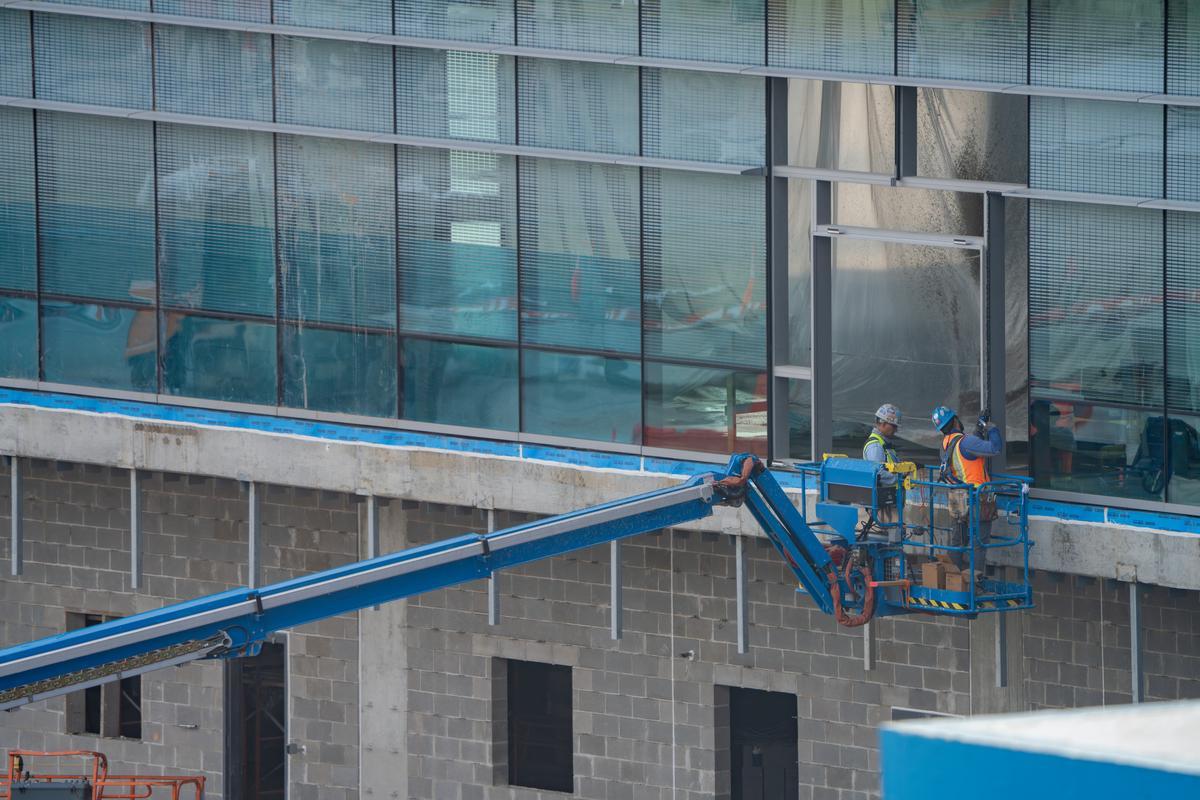 From the ground, the transformation is even more striking. Glass now stretches across the new Terminal B North concourse, catching reflections of the sky and signaling the terminal’s future form. Massive cranes tower above the construction zone as workers install roof decking, shape exterior cladding and guide heavy steel into place. Progress is layered: steel above, concrete below, and nonstop movement in between.