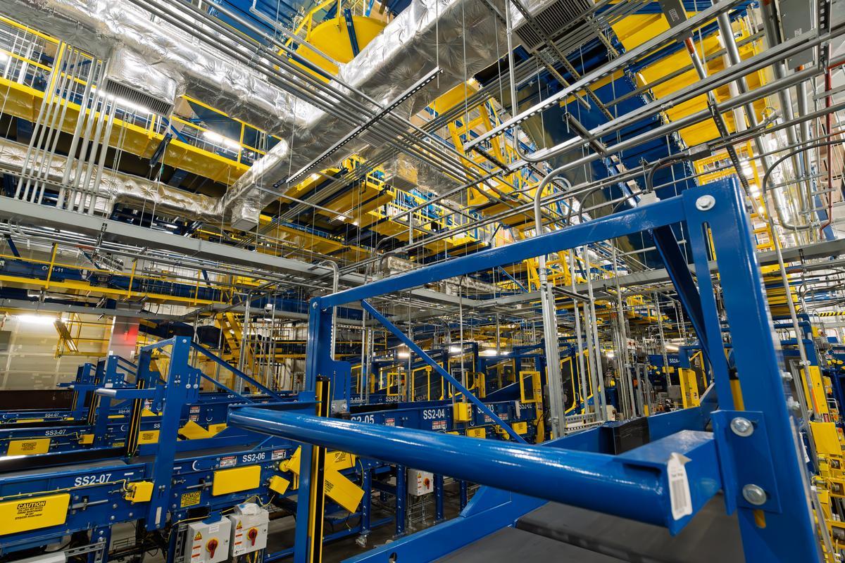 Bright blue conveyor frames rise in clean, geometric lines, crisscrossed by yellow catwalks and guardrails that create a grid overhead. Thick bundles of cable snake above and below, feeding power and data to hundreds of sensors designed to monitor movement, prevent jams and track every bag as it moves through required screening before ultimately being routed and delivered to an aircraft.