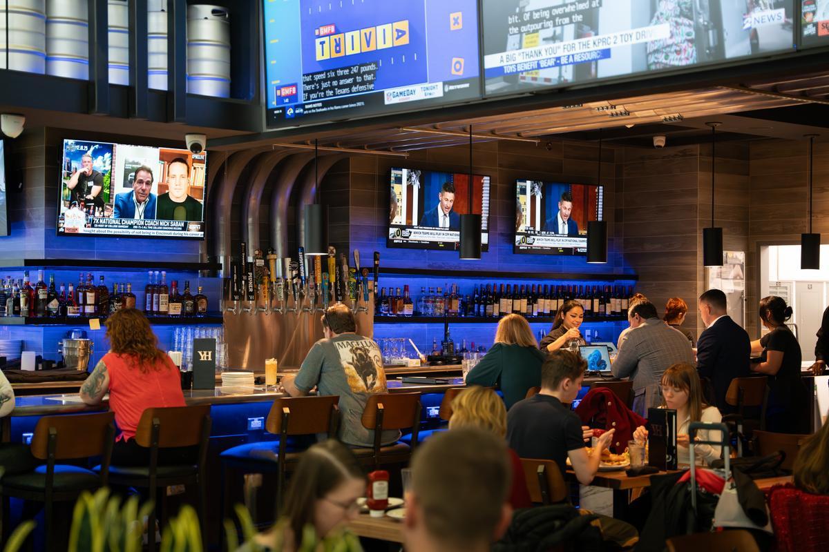 The menu includes burgers, sandwiches, salads and shareable plates, with options available from late morning through the evening. Televisions mounted throughout the space give it the feel of a neighborhood sports bar, while the open layout keeps sightlines clear for boarding announcements and foot traffic.