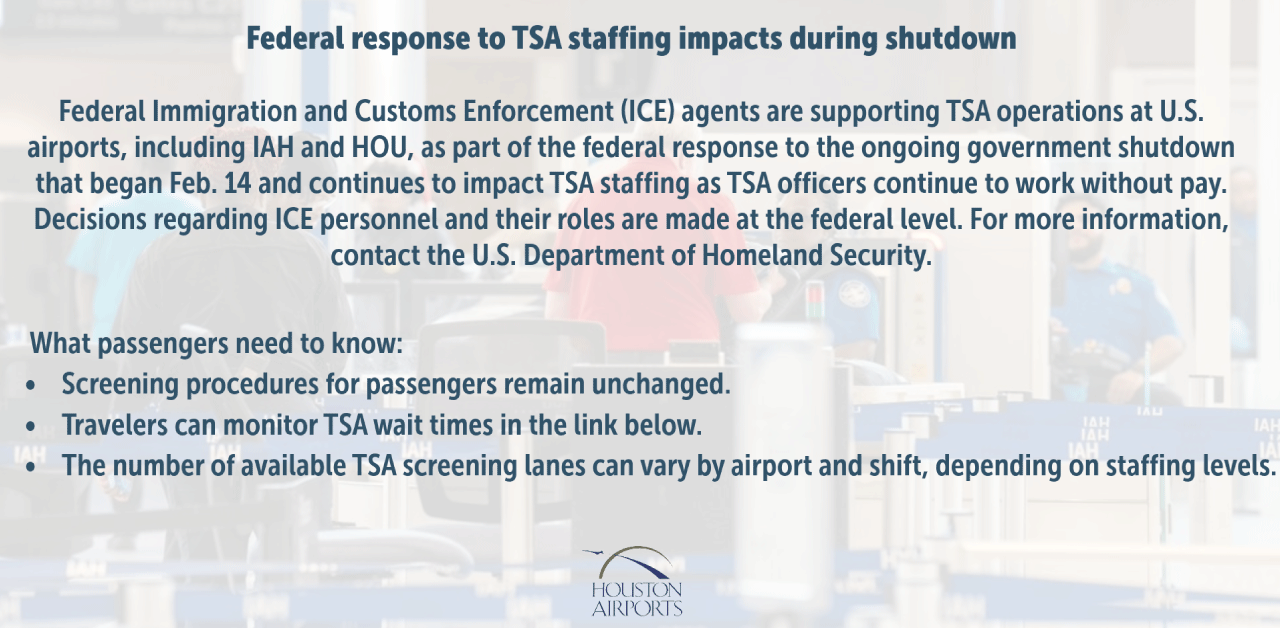 Houston Airports is also providing meals to on-duty TSA officers and coordinating with the Houston Food Bank to support officers and their families. Wings of Compassion, a nonprofit organization that supports the Houston Airports community, is providing fuel assistance to TSA officers.