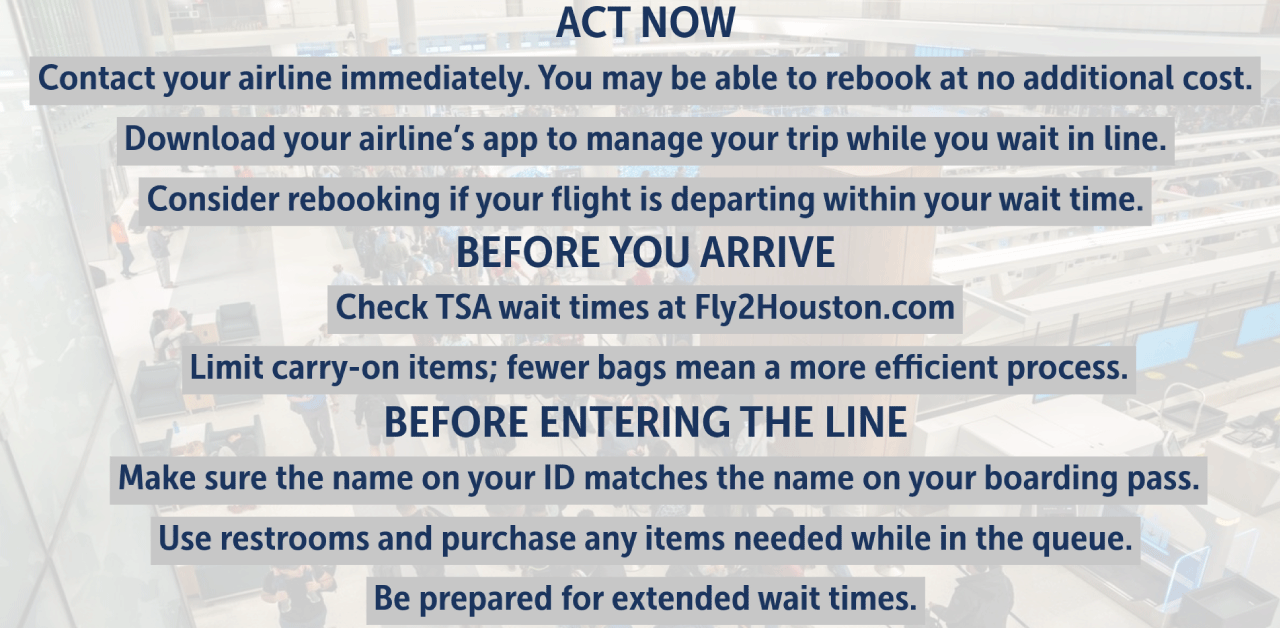 TSA lines could exceed four hours at IAH. Please plan accordingly. This guidance aligns with airline ticket counter hours and helps ensure passengers have enough time for check-in, security screening and reaching their gate.