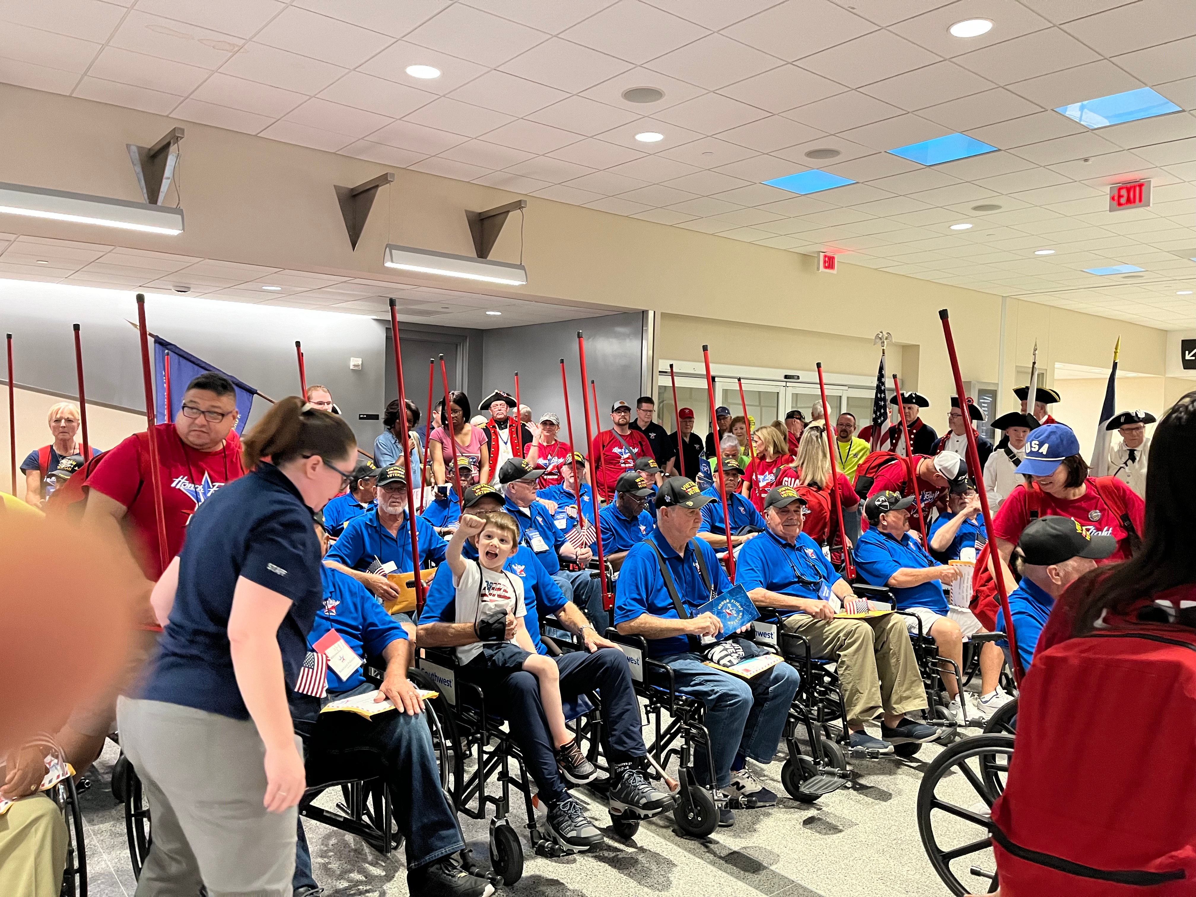 As the flight touched down at Hobby Airport, terminal employees and gate passengers cheered for the veterans’ return. Southwest Airlines staff created decorations to add to the festive atmosphere. Houston Fire Department fire trucks lined the airport runway, their sirens wailing in a joyful salute.